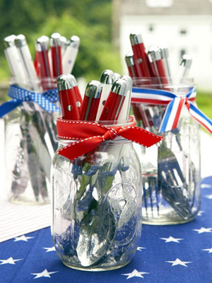 Navigating the backyard buffet is a breeze for plate-balancing guests when you station grab-and-go silverware in glass canning jars. Trim a trio of jars with ribbon remnants, and fill with eco-friendly reusable flatware.