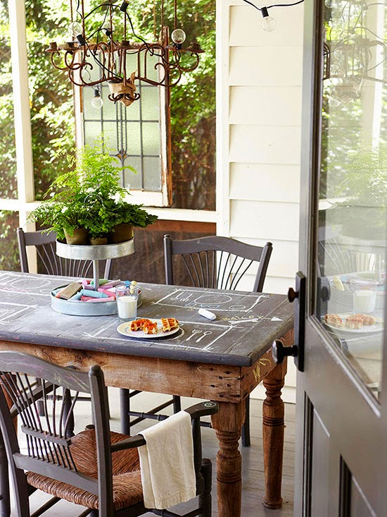 A table topped with chalk paint gives adults and kids alike, a fun drawing surface while corbeled table legs bring a certain elegance to the mix. A color palette of charcoal gray, white, and brown keep this patio feeling sophisticated. A wiry chandelier gives the space a slightly vintage feel.