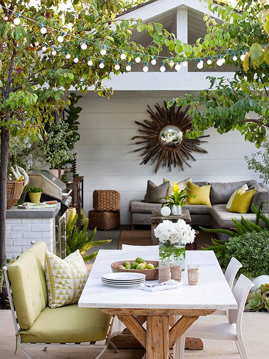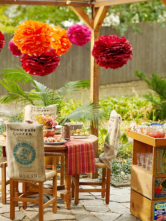 A Spanish-style table and chairs add warmth to this small patio. Burlap sacks cover the backs of chairs for a unique and eclectic look. Tissue paper pom-poms bring a bit of whimsy to the space while matching perfectly with a striped table runner. A rustic stone floor finishes off the look and connects the patio to the garden.