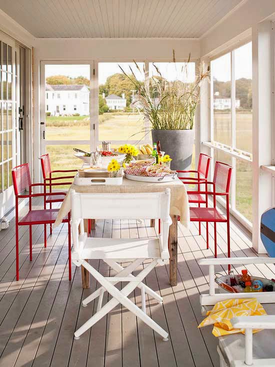 Simple, geometric shapes make this screened-in porch feel modern and up-to-date. Bright red chairs add color to the scene while a gray floor helps to further define the space. A clean linen tablecloth gives the space a relaxed, beachy vibe.