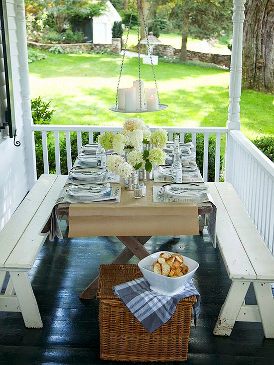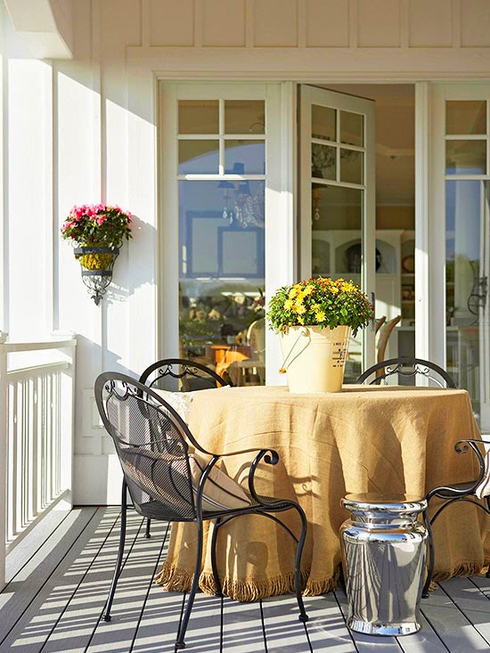 A burlap cloth brings texture to this metal table and chair set and even adds some country character. Little touches like fresh flowers and a bucket used as a planter make this small space feel quite cozy.