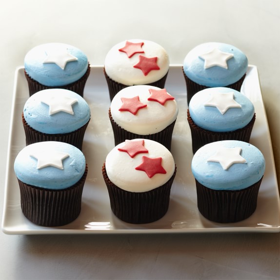 Patriotic Cupcakes, Set of 9 – Our all-American cupcakes are a sweet way to show your patriotism or ideal for celebrating holidays like the Fourth of July. Made for us by Chicago’s famous More® bakery, they’re crafted by hand in small batches, using the very best ingredients for premium quality and scrumptious flavor. A perfect gift or festive dessert for your holiday celebration, the nine-piece sampler includes three flavors:Chocolate Vanilla: Deep dark Belgian chocolate cakes topped with vanilla buttercream frosting.Vanilla Valrhona: Moist vanilla cakes filled with creamy Valrhona chocolate mousse and frosted with vanilla buttercream and topped with a white fondant star.Red Velvet: A Southern classic, with light, super-moist chocolate-cocoa cakes lavishly topped with rich cream-cheese frosting.