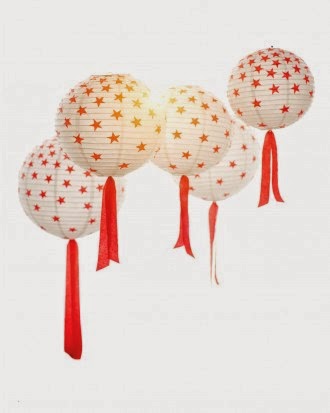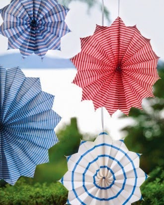 Paper Lantern Makeover ~ Give paper lanterns a patriotic makeover. To create a cascading star pattern, as shown here, cluster stars close together at the top of the lantern and paste stars farther apart toward the bottom and glue longer streamers to the bottom.