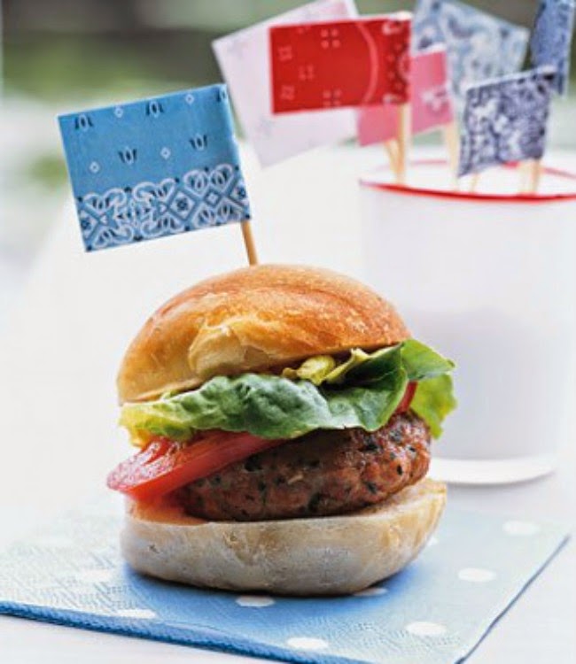 Food Flags ~ Plant red, white, and blue banners in your burgers and anything else you’re bringing to the picnic table. Cut small rectangles of festive scrapbook paper, fold around the top of a toothpick and pinch, hold together until secure.