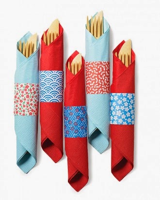 Paper Napkin Rings ~ Playful patterned cuffs spiff up paper napkins and make it a breeze for guests to grab their flatware at a barbecue buffet. Using double sided tape, cut rectangles from festive scrapbook paper and affix around the silverware.