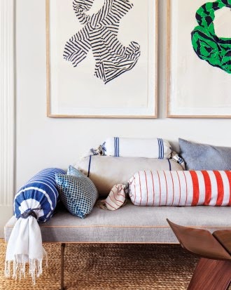 Patriotic Pillow Covers ~ Add hints of classic Fourth colors by taking a favorite fouta towel or scarf and turning it into a bolster cover.