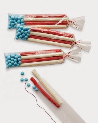 Flag Favors ~ A spirited holiday celebration calls for a fun take-home treat, like this goody bag of candies arranged to resemble the American flag. Start by partially filling a 2-by-10-inch cellophane bag with blue candies to stand in for stars. Then add red and white candy sticks to mimic stripes. Tie the bag with red waxed twine, and don’t be surprised if you catch yourself humming “Stars and Stripes Forever.”