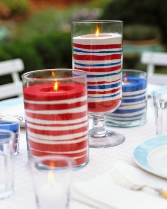 Easy Sand Castles ~ Red, white, and blue bands of sand dress up votive candles to make flickering lights that are cheerful and fun. Layered colored sand and “twist” in votive cup or tea tight.