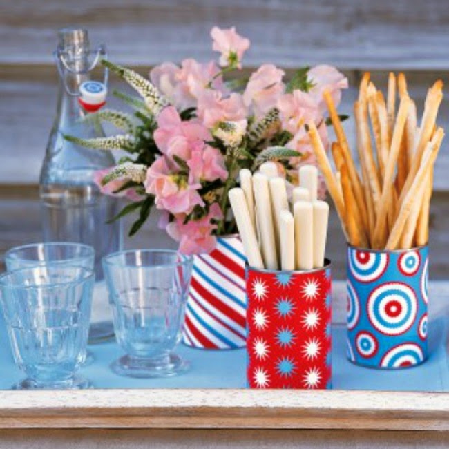 Can-Do Cans ~ Wrap up your holiday entertaining plans with these patriotic containers and fill them with flowers, utensils, breadsticks, and more. Using spray adhesive, affix festive scrapbook paper to a used, clean can and trim.