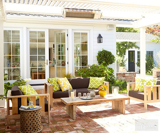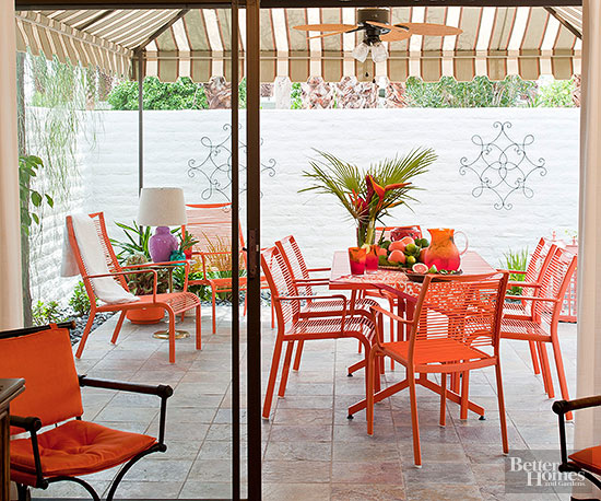 Give your outdoor space a unique flair by choosing a bold color for your furniture. On a budget? It’s amazing what a can of spray paint will do for old, rusty furniture. The cheery orange used on this outdoor furniture is also found inside, helping connect indoor and outdoor spaces.