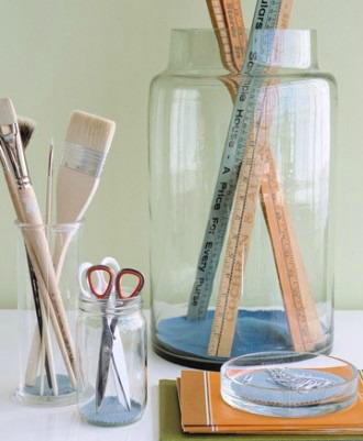 Don’t lose art and school supplies in the tangle of a junk drawer. Sort and store them in handy desktop containers made from jars of various sizes. To cushion the glass and protect scissor tips and pencil points, place a round of felt in the bottom of each jar.