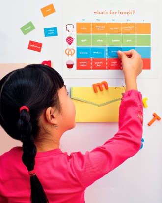 A kid may be more likely to eat her lunch if she helps choose the menu. When she uses this magnetic chart to map out her meals for the week, it saves time and helps make grocery shopping easier.