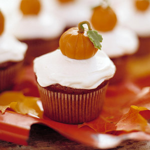 Ideal for family parties or classroom treats, these cute-as-a-button pumpkin cupcakes are topped with an easy cream cheese frosting and store-bought pumpkin-shaped candies to top. Ingredients: