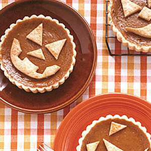 Directions: Place one disk of dough on a lightly floured work surface; roll out to 1/8 inch thick. Cut out six 6-inch rounds, gathering scraps and re-rolling dough once if needed. Fit rounds into six 3 3/4-inch fluted tart pans with removable bottoms. Trim dough flush with tops. Refrigerate on baking sheets 30 minutes. Repeat with second disk of dough.Roll out remaining dough to 1/8 inch thick. Transfer to a parchment lined baking sheet. Refrigerate 30 minutes.reheat oven to 375 degrees F. Whisk pumpkin, 1 cup cream, whole eggs, honey, sugar, salt, and spices in a large bowl. Divide among tart shells. Bake tarts on baking sheets until edges are golden brown and filling has set, about 30 minutes. Let cool on wire racks. Keep oven on.sing a paring knife, cut out jack-o-lantern features from the chilled dough; transfer cutouts to a parchment lined baking sheet.Chill in freezer 15 minutes. Whisk yolk and remaining 2 tablespoons cream in a small bowl. Brush cutouts with the egg wash. Bake until golden brown, about 9 minutes. Let cool completely on a wire rack. Arrange cutouts on top of cooled tarts, and serve.