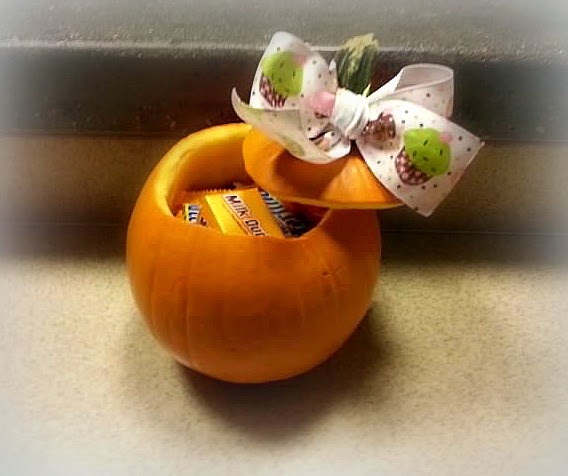 We bought pie pumpkins, a big bag of candy and I already had tons of cupcake grosgrain ribbon (from when I made and sold bows) to get us going on this too cute one-of-a-kind treat bag. We cut the tops off, scooped out the guts and cleaned them thoroughly. We filled each with candy and tied bows around the stem….VIOLA the cutest treat bag ever (and no one else had one like it)!
