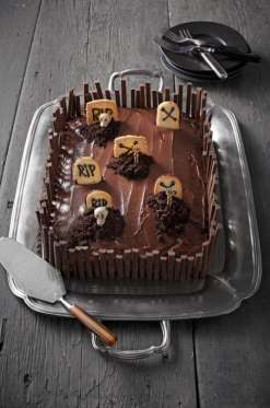 The key to this mini-cemetery: tombstones fashioned from Pepperidge Farm’s Milano and Bordeaux cookies.To decorate the tombstones, fill a resealable plastic bag with chocolate frosting, seal the bag, and snip off a tiny corner.Pipe RIP or X on the upper half of each cookie. Push the cookies into the cake (as shown) and pile crushed chocolate wafers in front of a few to conjure dirt mounds.Trim the perimeter of the cake with a fence of Rademaker chocolate sticks ($9.47 for six boxes of 12 sticks; amazon.com), cut to various heights.Finally, separate and insert pieces of small plastic skeletons ($2.70 for garland of four; amazon.com) into the cookie-crumb dirt.