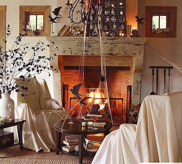 Throw Sheets Over Your Furniture ~ When nobody has lived in a house for years, homeowners will often throw sheets over their furniture to protect the pieces from sun damage and dust. You can do the same, and we guarantee your guests will be totally creeped out. Bonus – it protects your furniture from spills during Halloween parties.