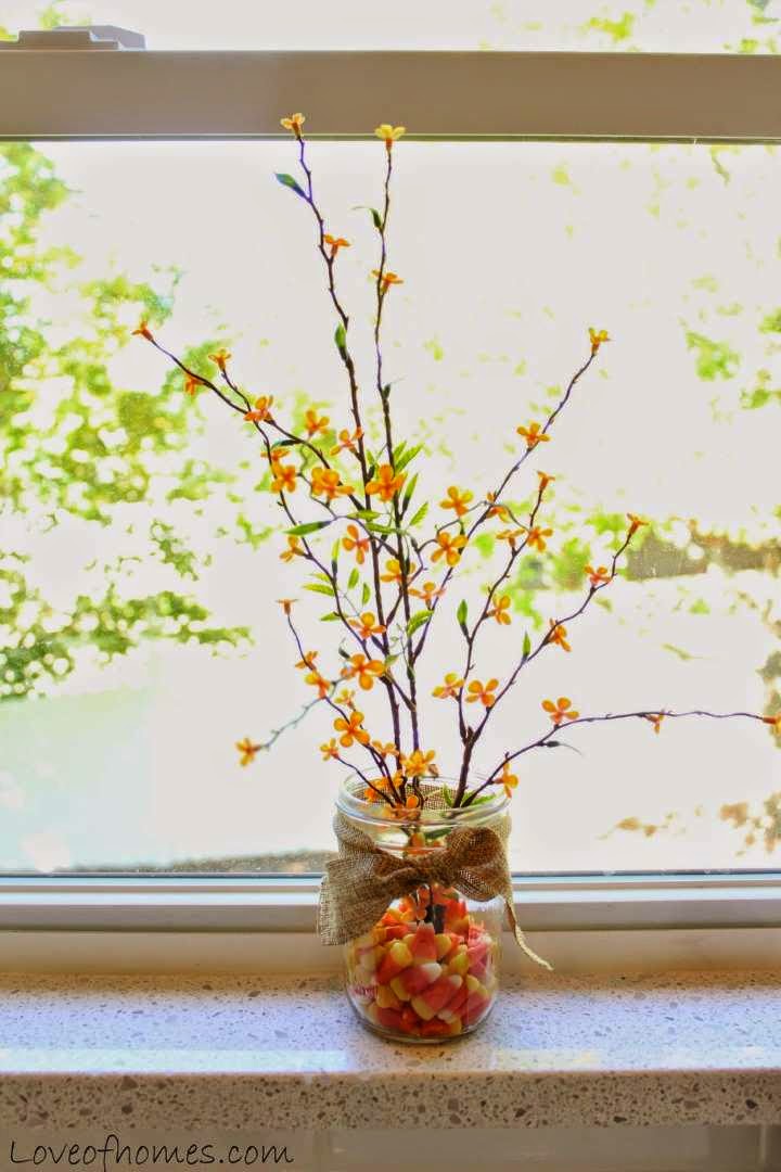 Place some candy corn into the bottom of a mason jar to help prop up elegant branches and add a touch of fall flair.