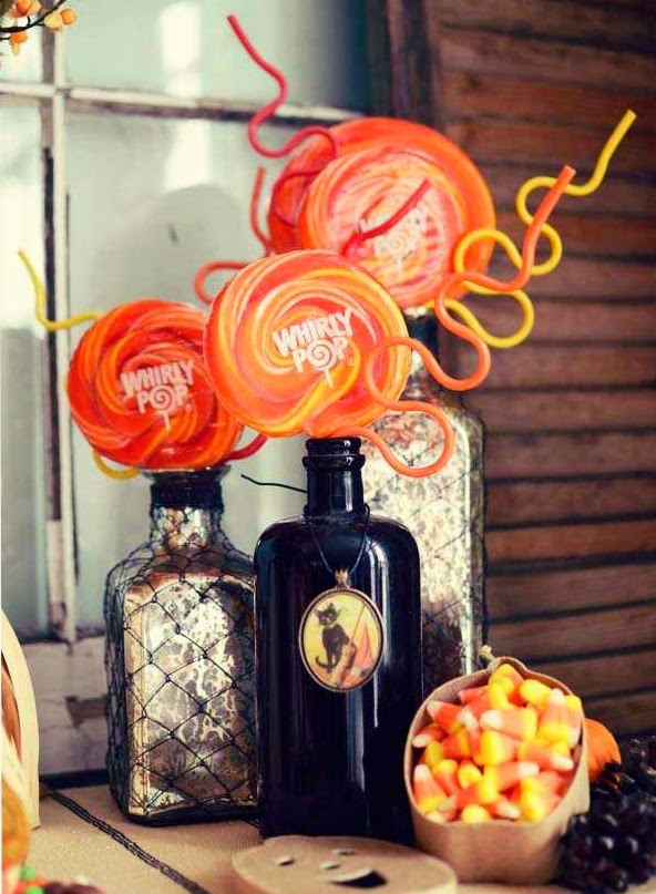 This dessert table packs an unexpected punch by displaying oversized suckers in vintage bottles.