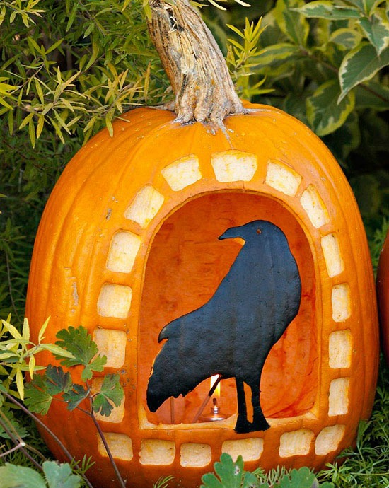 A combination of black acrylic paint and carving tools are all it takes to create this Halloween pumpkin. After the crow is cut out and the windows are gouged, paint the bird black. To set this cool pumpkin carving idea, spray with varnish.
