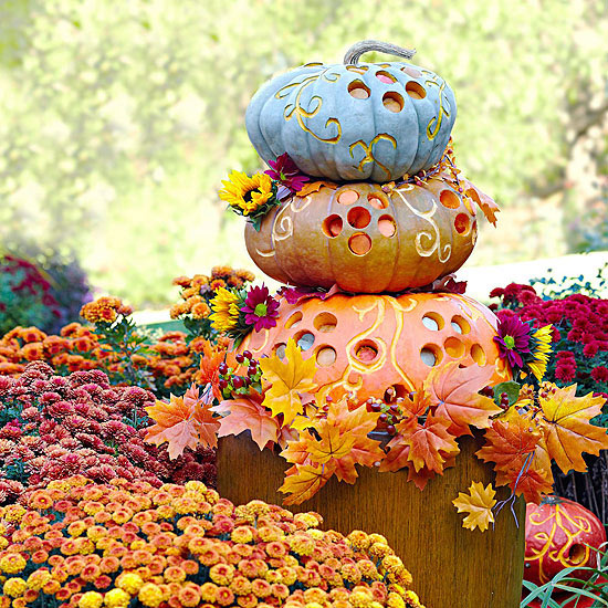 When it comes to cool pumpkin carving ideas, it doesn’t get much more amazing than a colorful stack decorated with flowers, swirls, and dots. Find three flat-bottom pumpkins in graduated sizes and different colors. Without hollowing them out, use a 3/4-inch hole-saw bit and drill circles in different patterns and shapes. Switch the resulting “plugs” between different pumpkins for extra pops of color, then use a vegetable peeler to etch the swirls. Finally, remove the stems from the two larger pumpkins and stack them. Elevate them on a pedestal, doorstep, or wooden barrel.