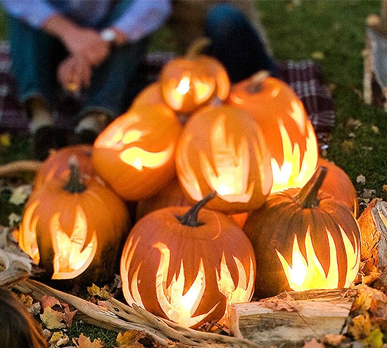 If you have a little more time, you’ll have fun pulling together this cool carving idea. Add the bonfire centerpiece to a backyard table or use it as a focal point in front. You’ll need about 10 to 12 pumpkins and flickering candles to make these flames come to life.