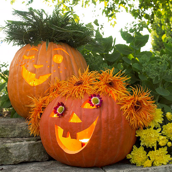 Full of big grins and fresh accents, these festive floral designs put a lighthearted twist on Halloween pumpkin carving. Creating them is simpler than it looks: Cut off the top or drill holes to tuck in flowers and branches (cucumber slices, carved potatoes, and ferns make other fun options). Attach other accents with pins, toothpicks, or glue.