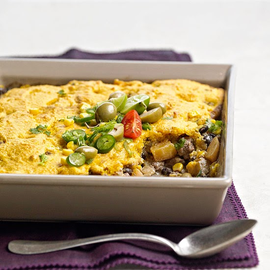 Directions: Preheat oven to 400 degrees F. In large skillet cook ground beef, pumpkin, and onion over medium heat until meat is browned and onion tender, breaking up ground beef with spoon; drain fat. Stir in black beans, corn, chiles, and salt. Heat through. Stir in broth and cream cheese until blended. Transfer mixture to 2-1/2-quart baking dish. In medium bowl stir together corn muffin mix, egg, milk, and Pumpkin Puree until just combined. Spoon over beef mixture. Bake 20 minutes or until toothpick inserted into topper comes out clean. Serve with Jalapeno-Olive Relish.