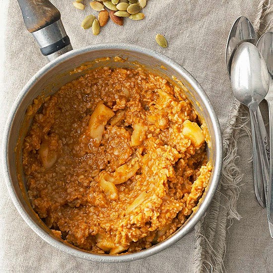 Directions: In a medium saucepan combine the water, apple juice, pumpkin, and dried apples. Bring to boiling. Meanwhile, in a small bowl stir together oats, brown sugar, 1 teaspoon cinnamon, and nutmeg. Stir oat mixture into boiling pumpkin mixture. Cook for 1 minute, stirring occasionally. Top each serving with yogurt and, if desired, additional cinnamon, honey, and pumpkin seeds.