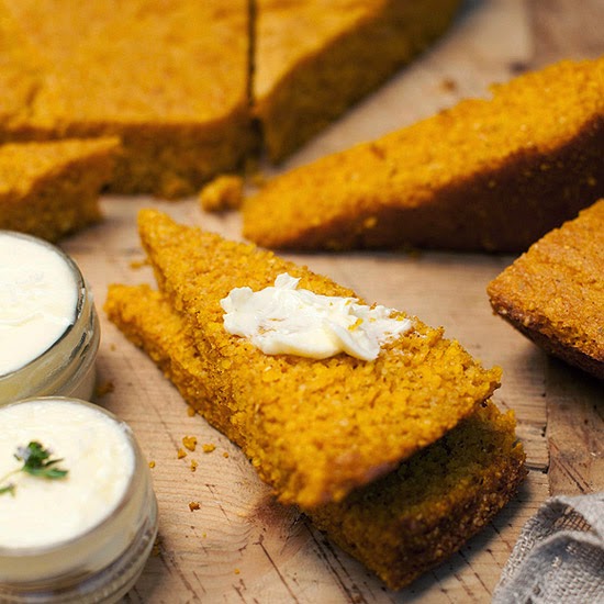 Directions: Preheat oven to 350 degrees F. Generously brush a 12-inch cast-iron skillet with 2 tablespoons of the butter; set aside remaining butter. In a large mixing bowl combine cornmeal, sugar, masa harina, baking powder, baking soda, salt, and pumpkin pie spice. In another bowl combine remaining butter, buttermilk, sour cream, egg, and pumpkin; whisk into cornmeal mixture. Pour into prepared skillet. Bake for 22 to 25 minutes or until a toothpick inserted off-center comes out clean. Cool on wire rack; serve warm with whipped butter.