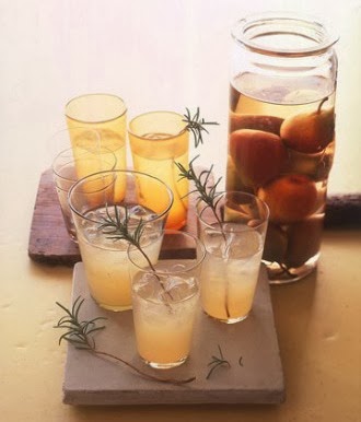 Directions: Put enough pears into a 48-ounce glass jar to fill. Add vodka. Seal jar, and let stand at room temperature 2 weeks (up to 2 months). Heat sugar and 1 cup water in a medium saucepan over medium-high heat, stirring until sugar has dissolved. Add rosemary; remove from heat. Let stand 30 minutes. Discard rosemary. Let cool completely. Syrup can be refrigerated in an airtight container up to 1 month. Fill 12-ounce glasses halfway with ice. Add 4 tablespoons vodka, 2 tablespoons syrup, and 3 tablespoons pear nectar to each. Top with 1/2 cup sparkling water. Serve garnished with rosemary sprigs.