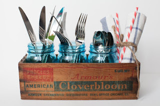 Fourth of July festivities practically beg for vintage decor, so put favorite nostalgic items to use. Old cheese boxes and blue Mason jars provide storage for forks, knives and spoons.