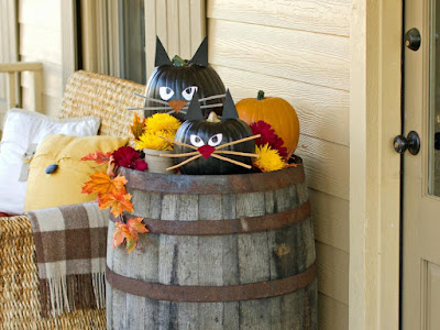 Welcome trick-or-treaters and Halloween guests with a litter of black cat pumpkins. These carve-free kitties are easy making them a fun project for older children or small kids with a little help from a crafty adult.