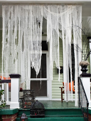 These billowing, tattered draperies made from budget-friendly cheesecloth will add an eerie atmosphere to your front porch or an interior doorway. Adorn with black vases, twigs spray painted black, pumpkins, etc.