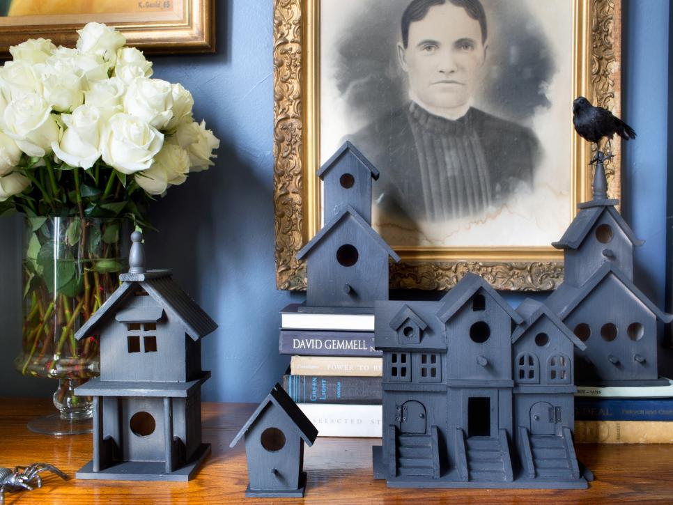 All you need for this project is some matte black spray paint, pumpkins of course and some craft store birdhouses to make this eerie mini landscape. To bump up the creep factor, add oversized spiders, rubber snakes or faux birds to your scene.