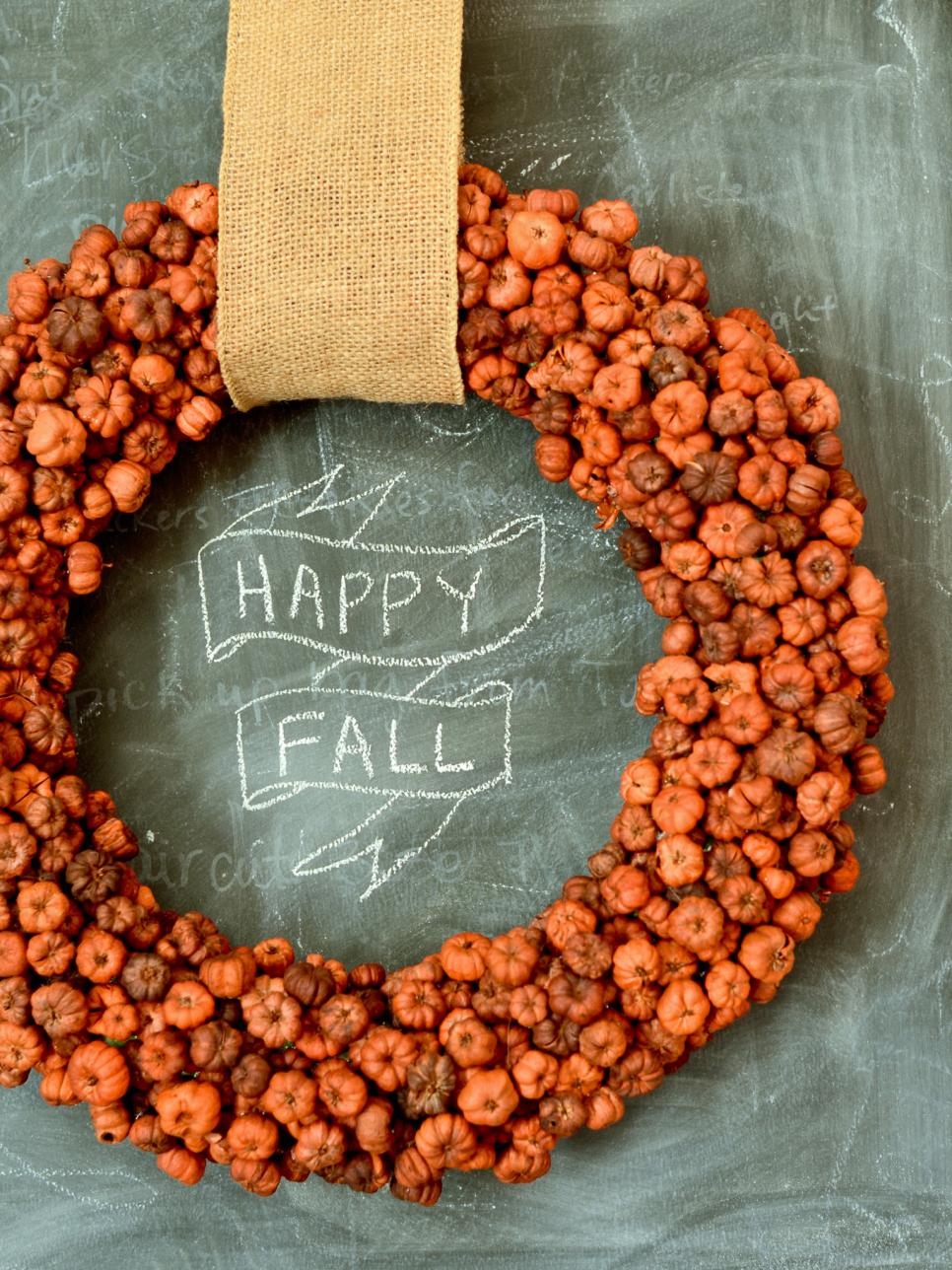 Although the tiny orange shapes covering this wreath look like diminutive pumpkins, they’re actually putka pods. A great stand-in for mini pumpkins, the dried organic seed pods don’t deteriorate, so your wreath can be displayed year after year. Just get a wreath form, some of these pods or actual faux mini pumpkins and hot glue away!
