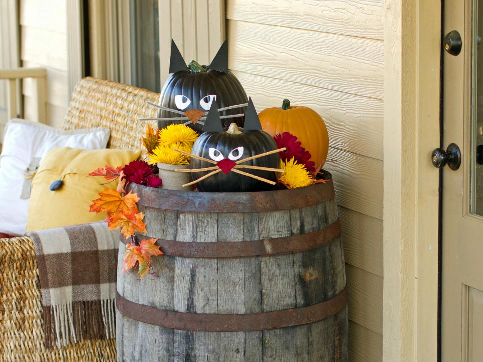 Welcome trick-or-treaters and Halloween guests with a litter of black cat pumpkins. These carve-free kitties are easy making them a fun project for older children or small kids with a little help from a crafty adult.