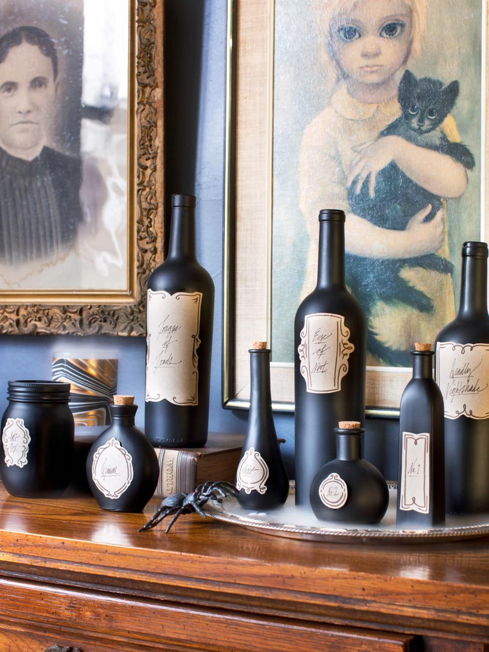 Don’t toss those old bottles, instead turn them into sleek Halloween decor. To get this look: Thoroughly clean the glass; once dry, coat each bottle with one coat of spray primer and 2-3 coats of matte black spray paint. Add a label {created using scrapbook paper and computer} and display your potent potables as a group.