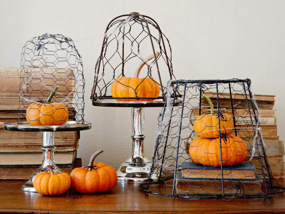 Upcycle a metal lamp frame using chicken wire, into a rustic cloche you can use year-round. Add pumpkins, plastic spiders and webbing to create a Halloween vignette.
