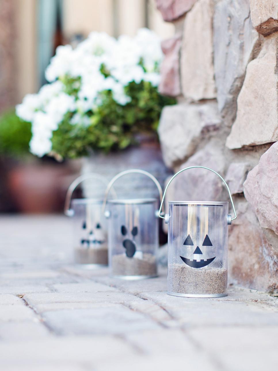 Fill clear buckets or cylindrical vases purchased at the dollar store with sand for weight, create jack-o-lantern faces with sharpies and plop in a battery-operated tea light to craft these kid-safe, fireproof luminaries. Perfect for a kid craft and fun to see as a grouping.