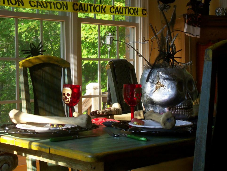 You can set a frightening table with minimal items like the one shown here ~ just add a metal skull as the centerpiece, red skull wine glasses and plastic bones on the place settings and you’re done. To add more of a scare, hang yellow CAUTION tape on the windows or chairs.