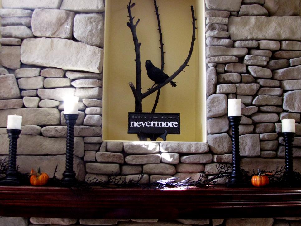 Place a black raven and spray-painted tree branches at the center of her fireplace mantel to represent Edgar Allan Poe’s poem The Raven. Black candleholders and miniature pumpkins give an extra dark touch.