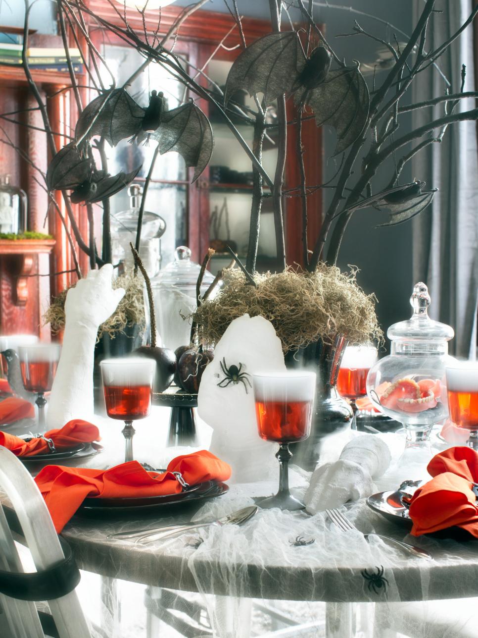 Gather a few of your favorite ghouls for a dinner party where handmade Halloween decor with a macabre twist sets the scene. Using twigs and sticks from the backyard, spray painted black adorned with bats from the dollar store, finish off this tablescape.