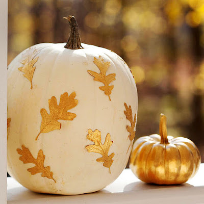 Shine bright this Halloween with a metallic pumpkins. First you will collect fallen leaves and spray-paint them gold, let dry. Paint one pumpkin white and the other gold. When dry, use crafts glue to attach the metallic leaves to the white pumpkin.