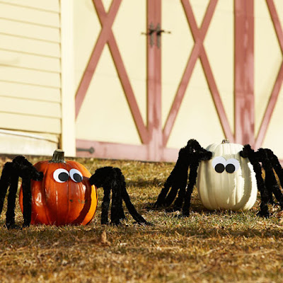 Create these crawling critters by orange or white medium-size round pumpkins. Make four holes in each side of the pumpkin with a drill bit and attach jumbo black chenille piper cleaners to create the spider legs. Use adhesive glue dots usually found in the scrapbook section, to connect white and black craft foam circles for spider eyes.