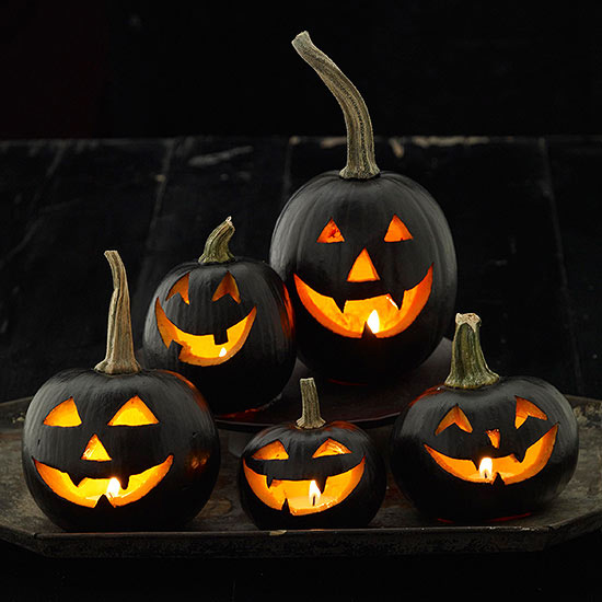This grinning jack-o’-lantern family is done by simply painting your jack-o’-lantern with black acrylic or spray paint before carving. TIP: Make sure to use painter’s tape around the stems to keep them paint-free.