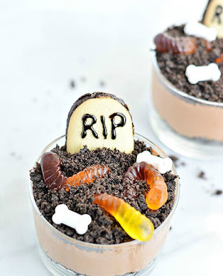 Kids will love decorating these chocolate mousse cups with edible bones, gummy worms, and headstone cookies! Simply fill cups with pudding, crush hydrox cookies to put on top as dirt and tuck in gummy worms. Use sandwich cookies and an icing pen to write RIP.