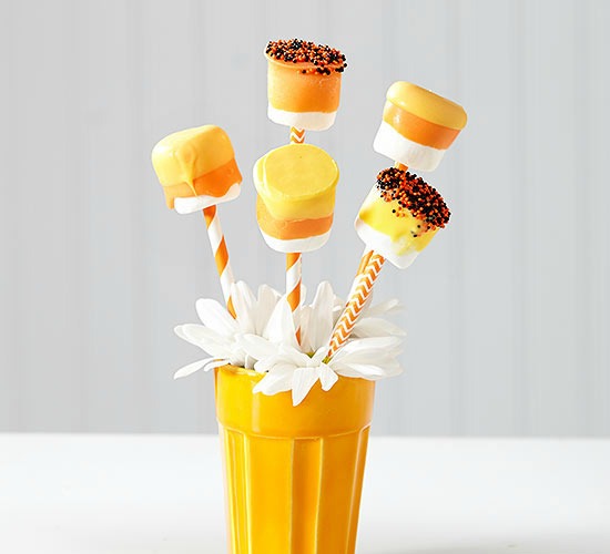 Melt, dip, and dry are the basic steps to enjoy these delightful marshmallow pops.Place orange-color and yellow-color candy coating discs in separate microwave-safe bowls. Microwave separately on high until melted and smooth, stopping to stir every 30 seconds.