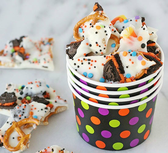 Craving something salty and sweet? This irresistible blend of pretzels, chocolate, and candy is frighteningly good and an easy Halloween treat. Line a 15-in. x 10-in. x 1-in. pan with foil. Brush with 1 tablespoon melted butter; set aside. In a microwave-safe bowl, melt white chips then stir until smooth. Stir in the candy pieces, small pretzels and cookie pieces of your choice. Spread into prepared pan. Chill until firm. Break into pieces and fill paper cups.