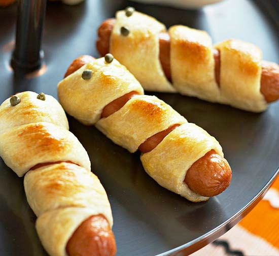 Hot dogs are a party favorite and will become the star of a Halloween buffet when given this mummy-wrap treatment using refrigerated breadsticks. Simply wrap a breadstick around a hot dog and bake. Use whatever you can come up with that everyone will like for the eyes. Pepper corns are used here…hmmm!
